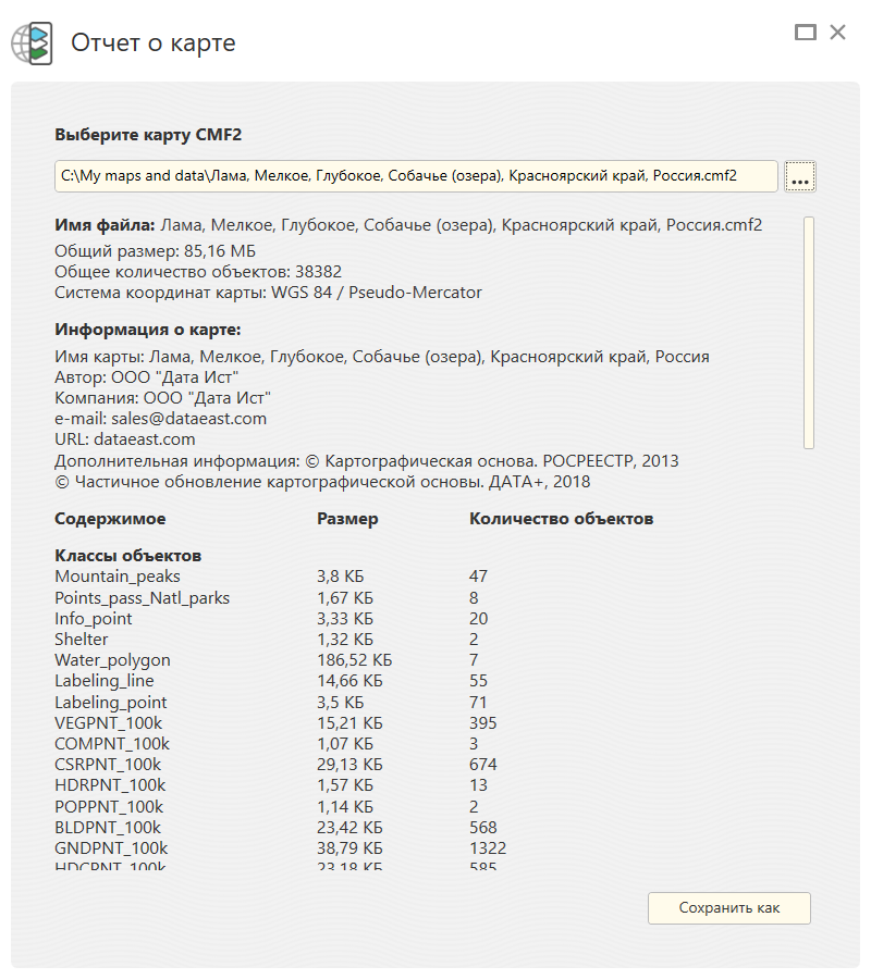 Содержимое карты: количество объектов, слоев и их размер.